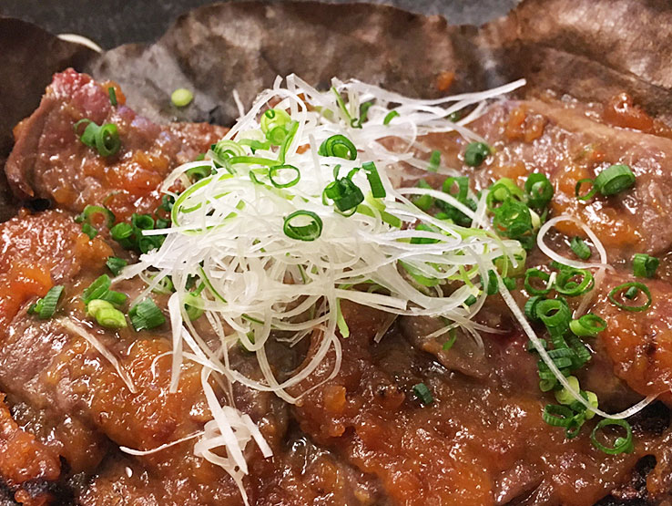 岩手ファーマーズミートの黒毛和牛を使った朴葉味噌焼き 1,300円(税別)。朴歯の葉には、もろみ味噌に牛脂、セロリ、ニンニク、リンゴを混ぜたものを乗せ、そこに岩手ファーマーズミートの黒毛和牛を乗せて焼く。食べると風味豊が甘味が口いっぱいに広がる。